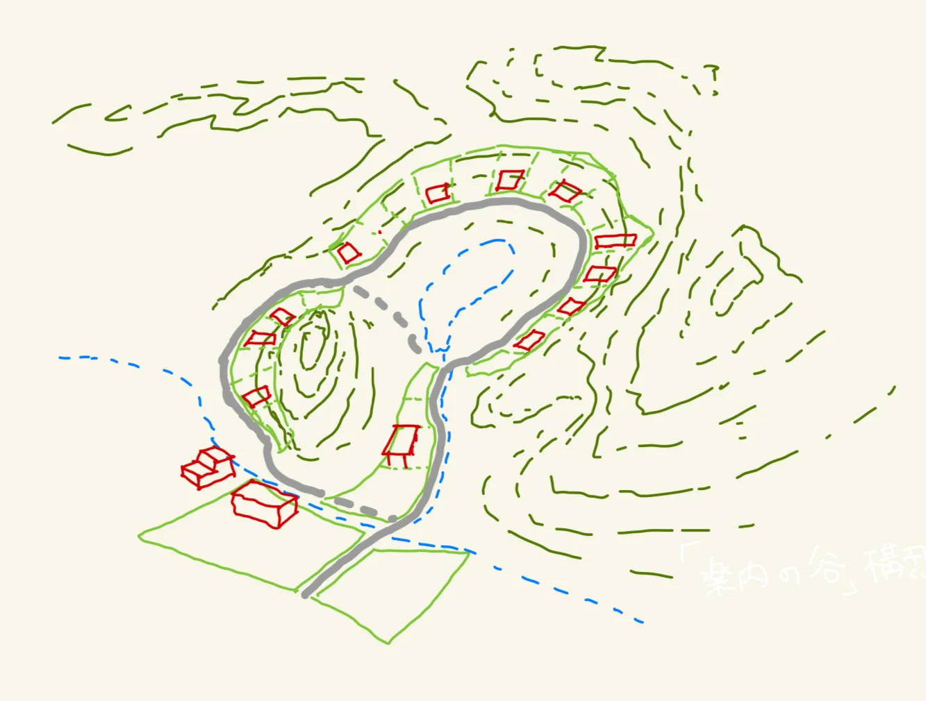 三春の楽内の自然の谷の地形に寄り添い、つながりある仲間が分け隔てなく、緩やかに集まり自分の時間を過ごせる場所を少しずつつくっていく。