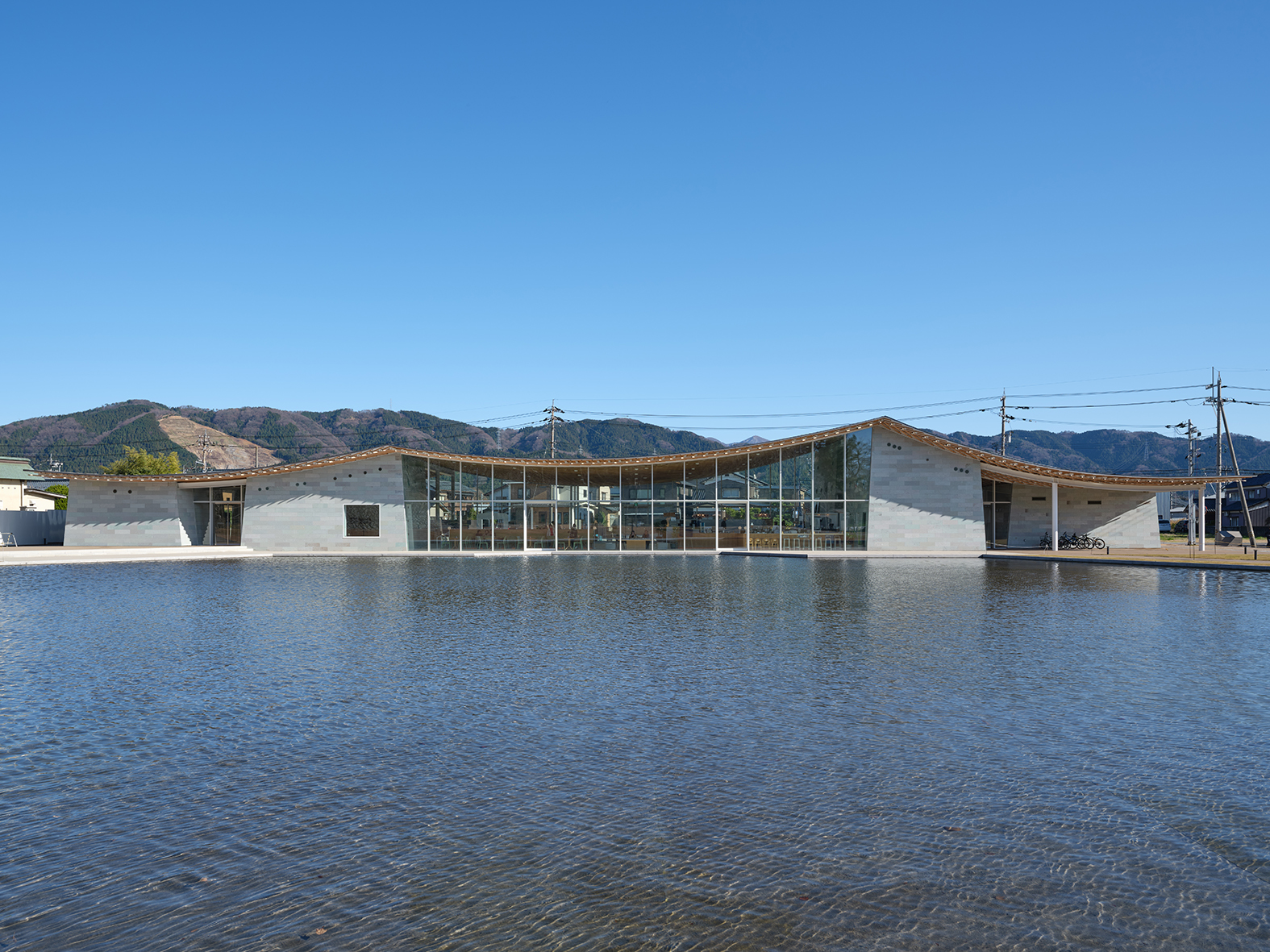 所在地:福井県坂井市丸岡町霞町/休憩所・展示・飲食・事務所/建築面積:1,166㎡/延床面積:1050㎡/構造規模:鉄骨造・平屋
